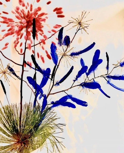 Arreglo floral compuesto por ramas intervenidas con plumas, estrellas de canutillos y satélite de color.